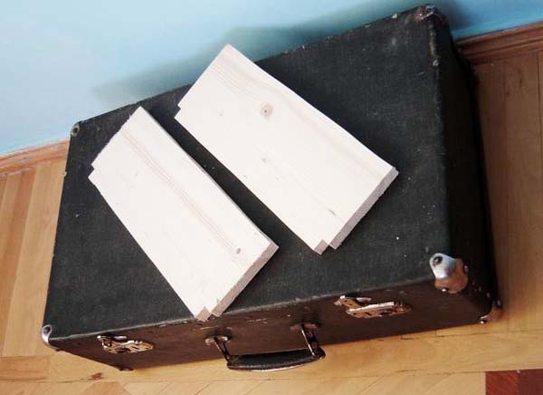 2. Из деревянной доски выпиливаем две полочки с выемками под раму чемодана и вставляем их на свои места, выравниваем, и саморезами закрепляем насквозь через боковые стенки чемодана.