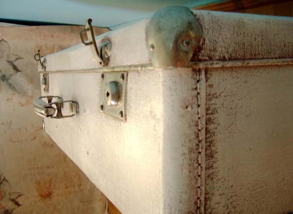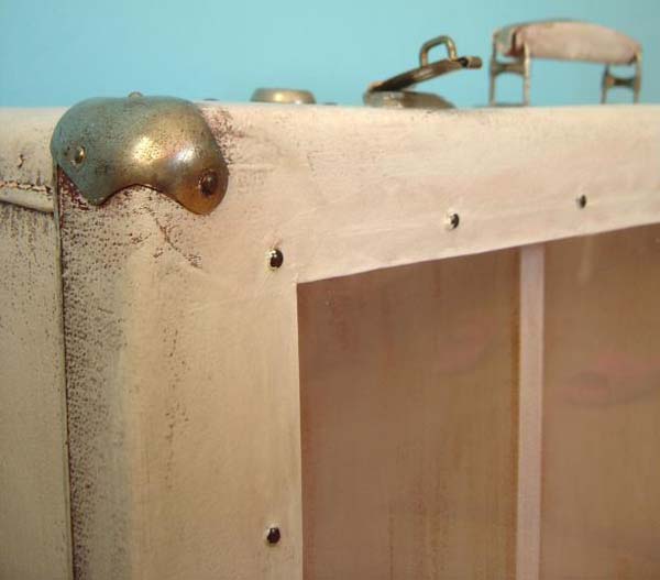7. Очищаем от краски металлические уголки, клёпки, замочки и ручку чемодана, покрываем уже «шкафчик» снаружи и изнутри акриловым лаком, чтобы его можно было мыть.