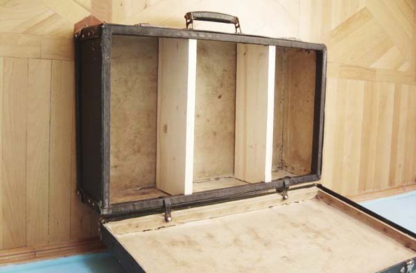 3. К задней стенке снаружи чемодана крепим две деревянные планки с закреплёнными на них петлями для подвешивания к стене.